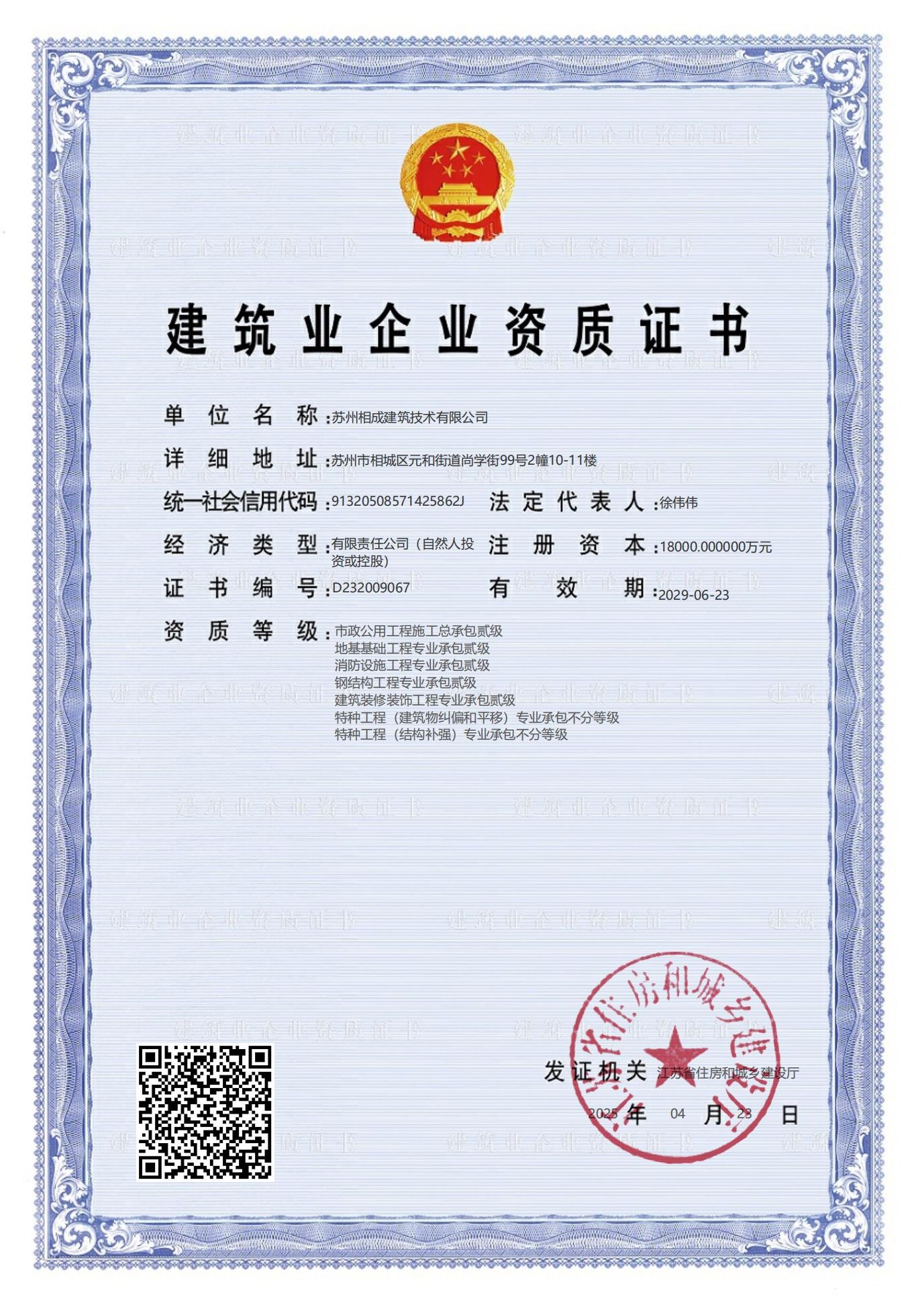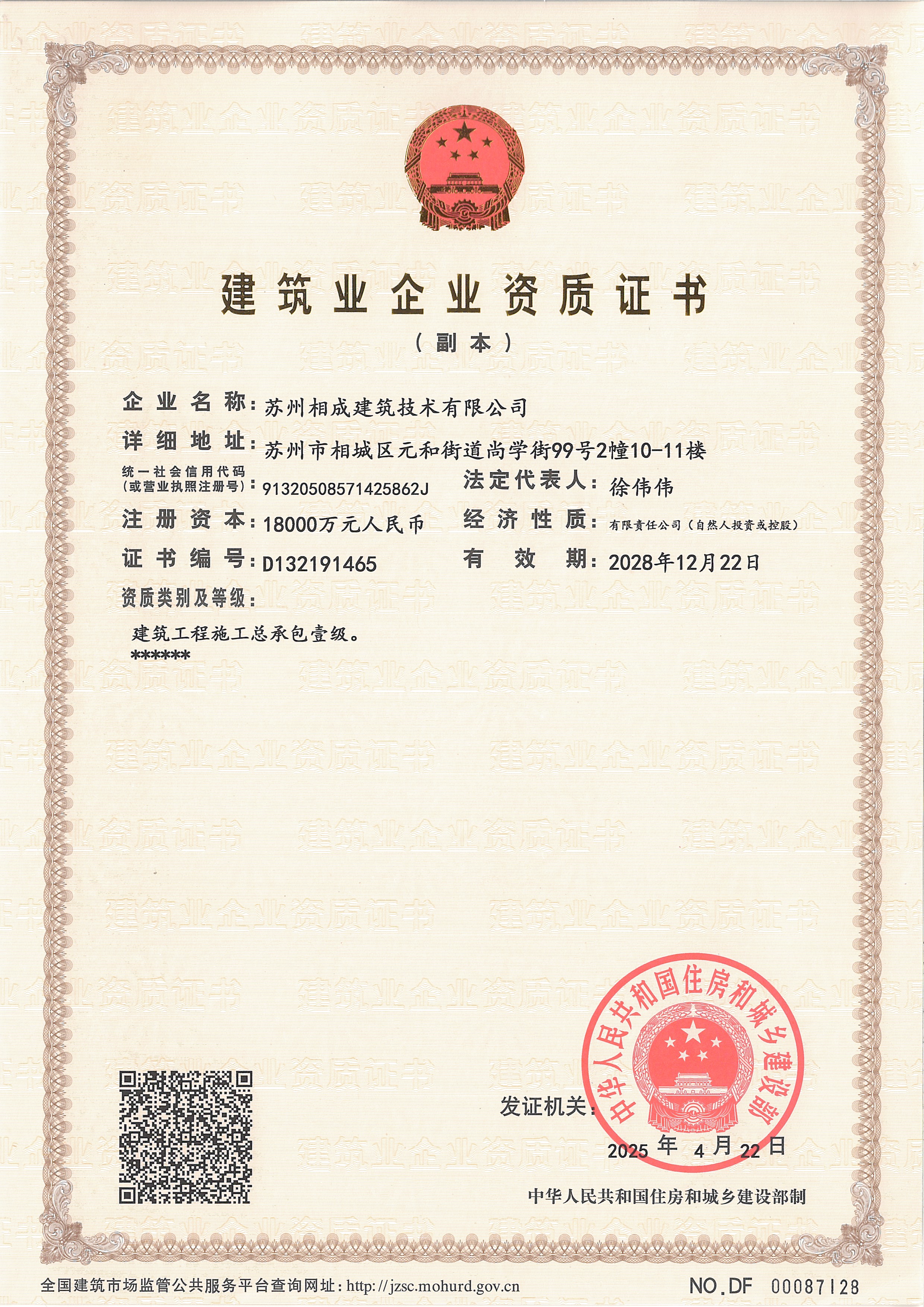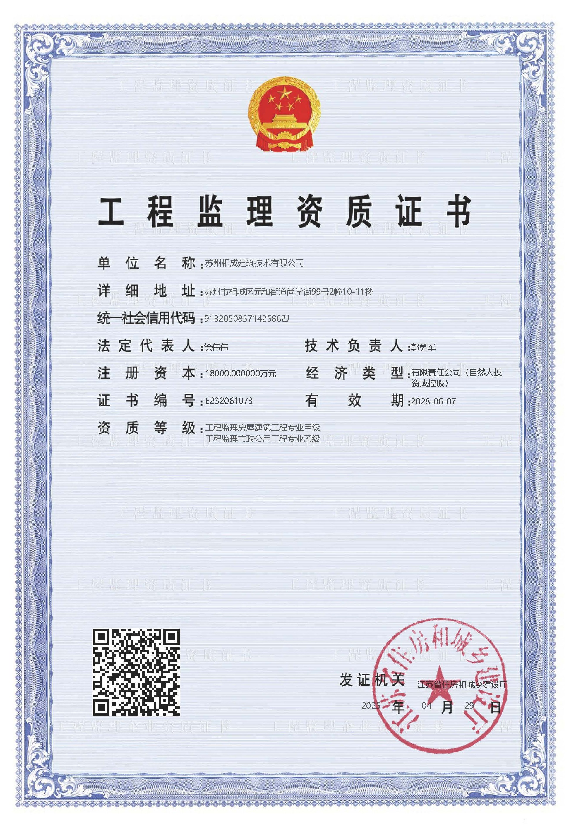 蘇州相成建筑技術(shù)有限公司是一家以提供建筑開發(fā)服務(wù)為主的建筑企業(yè),公司位于蘇州市相城區(qū),成立于2011年3月,注冊(cè)資本 10000萬,歷經(jīng)13年的努力于2022年7月獲省住建廳頒發(fā)房屋建筑工程施工總承包壹級(jí)資質(zhì),市政公用、建筑裝飾、地基基礎(chǔ)、消防設(shè)施、鋼結(jié)構(gòu)工程等專業(yè)承包二級(jí)資質(zhì); 2023 年6月份增設(shè)房屋建筑工程監(jiān)理甲級(jí)、市政一級(jí)監(jiān)理資質(zhì);目前是相城區(qū)唯一一家集施工總承包一級(jí)和建筑工程監(jiān)理甲級(jí)資質(zhì)的企業(yè)。